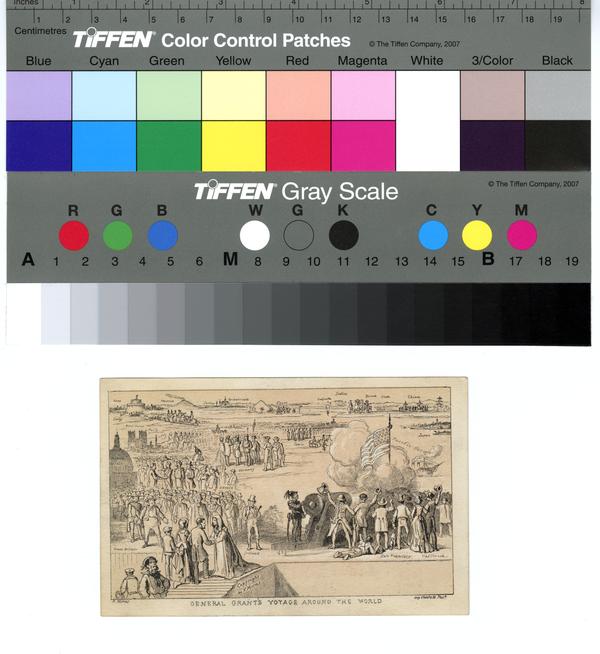 Trade card promoting clothier Perry & Co. and depicting Ulysses S. Grant's world tour with the nationalities he visited. After