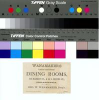Advertising text printed on verso: Wanamaker’s ladies’ and gents’ dining rooms, 823 Market St., & 42 S. Second St., Philadelphia. Geo. W. Wanamaker, Prop’r. [Over.]