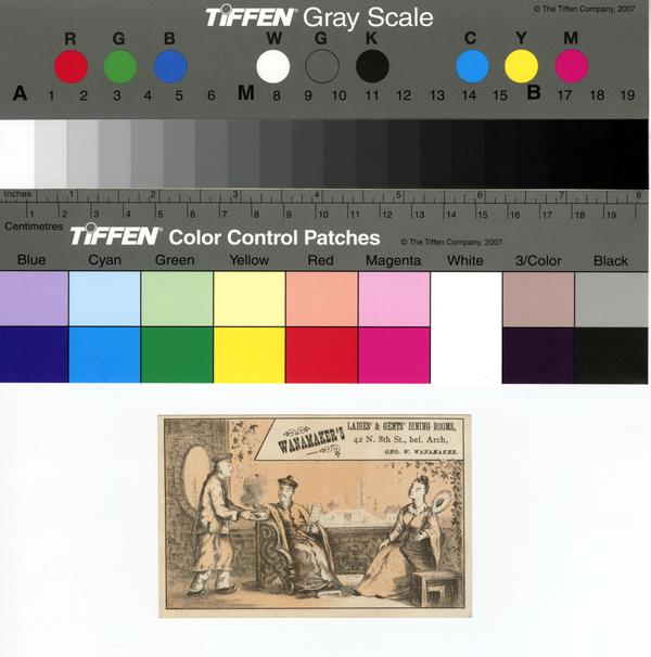 Advertising text printed on verso: Wanamaker’s ladies’ and gents’ dining rooms, 823 Market St., & 42 S. Second St., Philadelphia.