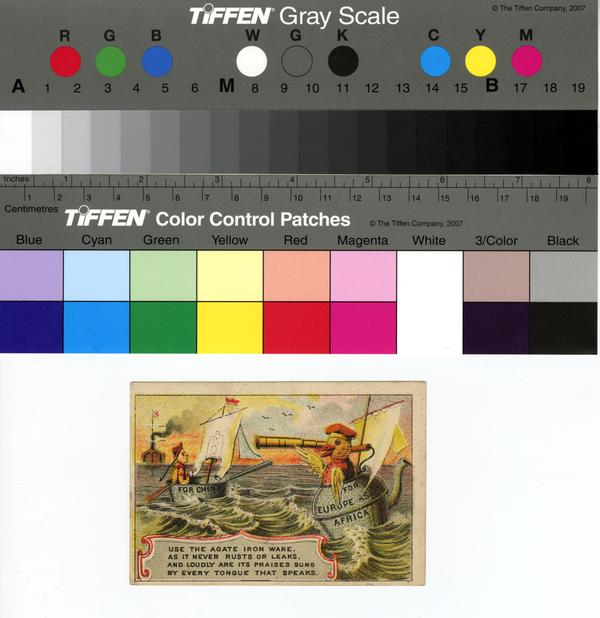 Trade card promoting Weber & Bro. and depicting a caricaturized Chinese man sailing in a pot and a duck sailing in a kettle.