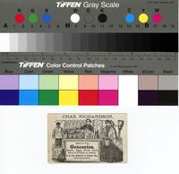 Trade card promoting grocer Charles Richardson and showing a man clerk helping two women shopping in the grocery store. The man stands behind the counter and holds a scoop to weigh the product on a scale. Two women shoppers stand in the right, one holding a basket. In the left is an advertising statue of a Chinese man wearing a long mustache and attired in a cap; long-sleeved, mandarin collared shirt; balloon pants, and cloth slip-on shoes. The statue is on a pedestal with Chinese characters. Products displayed for sale include a ham, barrel of oil, and brooms.