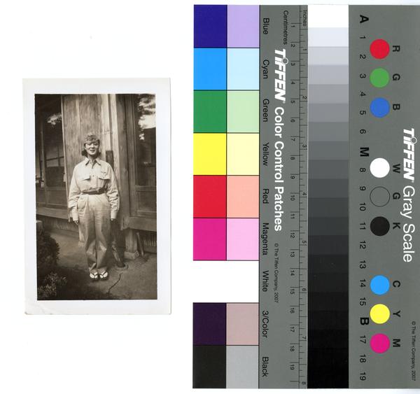 Portrait photograph of a Japanese woman who is wearing the uniform of an American Airman probably in Japan during the Allied occupation after World War Two. Shows the Japanese woman, attired in a garrison cap with pins, Air Force uniform of a collared, long-sleeved shirt and pants, Air Force pin with wings, belt, and geta shoes, smiling at the viewer. She stands with her arms at her side in front of a building. The back of a chair can be seen through the window in the left.
