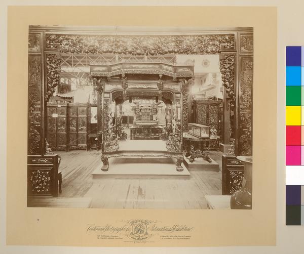 View depicting ornately carved Chinese furniture displayed in the Chinese section within the Main Building designed by Henry Pettit and Joseph M. Wilson at the Centennial Exhibition in Philadelphia. A wooden frame with carved fruits and flowers surrounds the display. In the center, shows a bedstead with carved figures of two men on each corner, lions at the top corners, and decorative leaves set atop a platform. In the right on a platform is a table with claw feet and legs with carved dragons and a pagoda. On top of the table is a glass display case containing carved figures. Behind the table is a wardrobe with carved flowers and leaves. In the center behind the bedstead is a desk with two chairs and a large credenza on top of which are pagodas and a cabinet with doors. In the left is a screen and side table. The Centennial Exhibition celebrated the centennial of the United States through an international exhibition of industry, agriculture, and art.