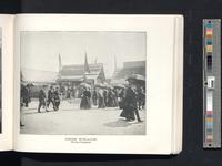 Publication depicting the World's Columbian Exposition, also known as the Chicago World's Fair, held from May 1 to October 31, 1893, to celebrate the 400th anniversary of Christopher Columbus's arrival. Shows images of the exteriors and interiors of buildings, such as Machinery Hall, Administration Building, Horticultural Building, Electricity Building, and Woman's Building. Thirty-six U.S. states erected buildings, images of which are shown in alphabetical order, including California, Idaho, and Pennsylvania. Approximately fifty foreign nations exhibited at the fair and eighteen countries erected buildings, including Norway, France, Ceylon, Japan, Turkey, East India, Colombia, and Haiti. Images include: "Japanese Ho-O-Den - Wooded Island"; "Building of Ceylon"; "Venetian Gondola and Japanese Ho-O-Den"; "In the Samoan Village"; "Samoan Village"; "Johore Bungalow:" "Javanese Village"; "Soudanese Baby-Street in Cairo"; "Japanese Bazar"; "Panorama of Kilauea"; "Japanese Bazar"; and "Chinese Theatre." The Japanese Ho-O-Den (Phoenix Palace) was designed by architect Masamichi Kuru and was located at the north end of the Wooded Island. It was later destroyed by fire. The display window of the Japanese Bazaar shows two mannequins attired in kimonos and Japanese decorative arts including vases. The Chinese pavilion consisted of a bazaar, teahouse, and replica of a temple or Joss House. Images of people include a Sundanese (ethnic group of Java or Indonesia) toddler and Samoan men. Also shows sculptures and fountains, the Ferris Wheel, boats on the waterways, and spectators walking the grounds.