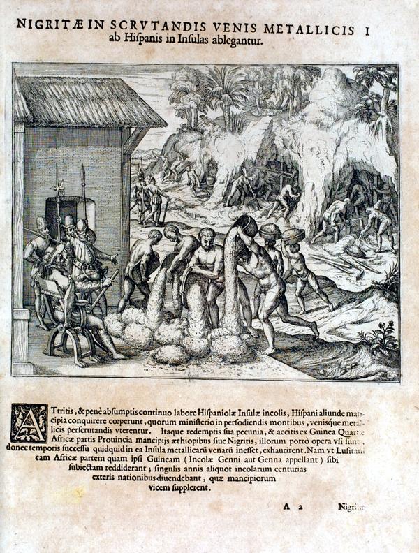 This mining scene is one of the earliest known illustrations of slave labor in the New World. Under the supervision of the