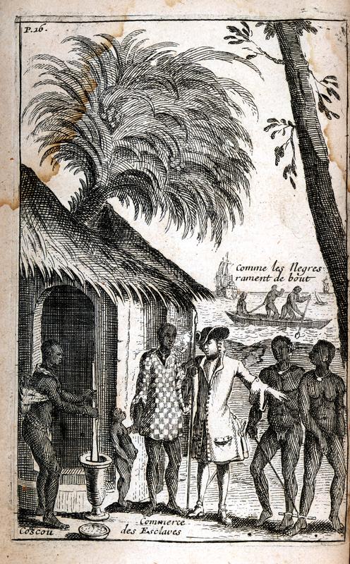 Two male slaves, who are bound together at the ankle, are bought by a European slave-trader. The figure to the left is most likely an African slave-trader. The man smokes a pipe and holds a small child by the hand. In the lower left-hand corner, a woman grinds corn ("coscou") with a mortar and pestle. An infant is tied to her back. Behind the group, three slaves paddle a small boat on the ocean ("comme les Negres rament de bout"). A larger vessel, possibly a slave-ship, is visible in the background.