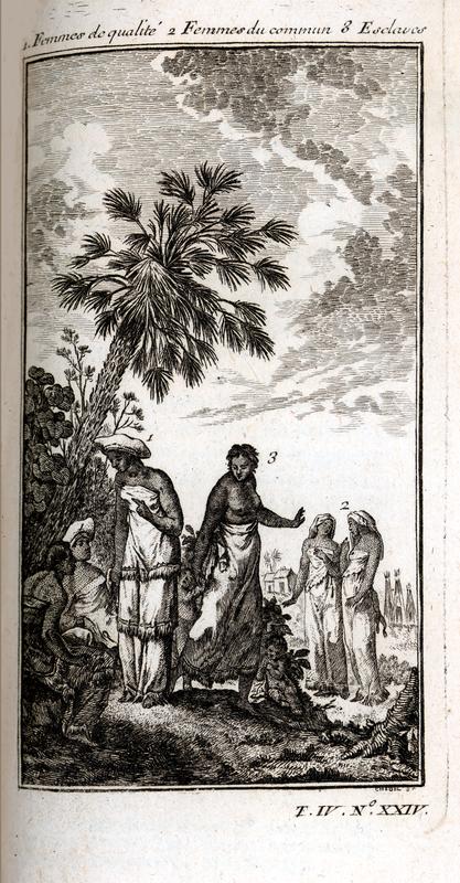 The engraving is included in Chapter III, "Negres du Royaume de Juida. Leur figure, leur habillement, leur caractere & leur nourriture." It shows, from left to right, an upper-class woman (Fig. 1), a female slave (Fig. 3), and two female servants (Fig. 2). They are dressed according to class: the upper-class woman wears a fringed dress and a comparatively elegent headdress; the servants wear simpler robes and head coverings; the slave wears a tunic around her waist, which leaves her breasts exposed, and her head is uncovered.