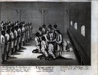 Depiction of an exorcism performed on a group of black baptismal candidates under the authority of the Moravian Church. According to the caption underneath the engraving, the figure marked "A" is the pastor who performs the ritual; those marked "B" are the deacons who assist him. The three figures marked "C" are black men who will be exorcised. With their hands folded in prayer, the candidates kneel around the pastor and the two deacons. The pastor and each of his deacons places a hand upon one of the candidates' heads; the two others wait. Behind them, the four figures marked "D" are black women who will be exorcised. Those marked "E" are identified as members of the black parish.