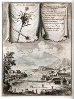 Illustration of a Jamaica sugar plantation. Key indicates the location of the plantation owner's house, workers' houses, part of the savanna or pasture, sugar fields, the water mill, the sugar house, waste from the mill, the purgatory?, and the heater for drying cakes of sugar.
