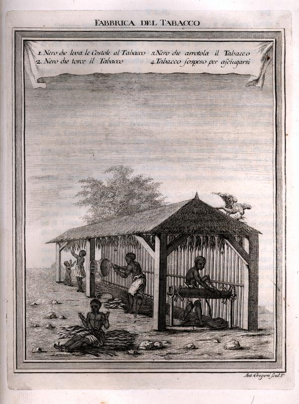 Key at the top reads: 1. Nero che leva le Costole al Tabacco; 2. Nero che torce il Tabacco; 3. Nero che arrotola il Tabacco ; 4. Tabacco sospese per aseiugarsi.