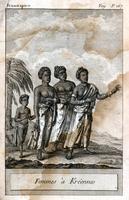 The engraving features three women from Kréennes and a young boy. Although it serves as the frontispiece, it accompanies letter VIII, "Du Fort de Christiansbourg, sur la Côte de Guinnée, Du 16 Octobre 1785," in which Isert discussed the importance of women's dress and appearance in Kréenes ("cette importante affaire"). As he explained, the women there often spent two hours at their toilette. The results of these efforts can be seen most clearly in the figure on the right: her hair is in a bun, and she wears a gold necklace. (In Kréennes, particular emphasis was placed on the decoration of head.) More strikingly, however, her skin is stamped with shapes, such as the cresent on her forehead and the star on her right forearm. As Isert noted, it was customary for women to soak wooden forms in bright paint and stamp their skin.