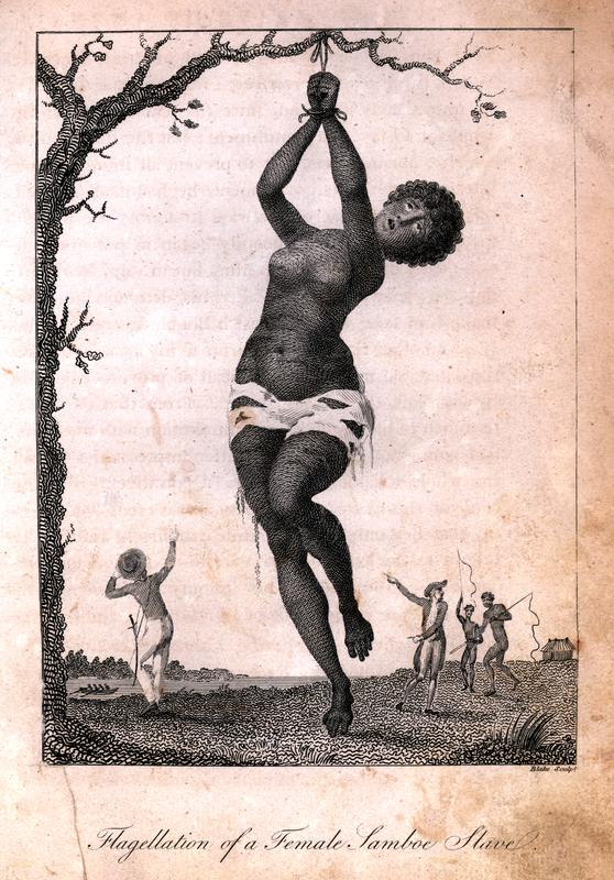 Engraving was done after one of John Gabriel Stedman's own drawings; it illustrates an incident that he witnessed during his travels in Surinam. According to Stedman's account, the image shows a beautiful Samboe girl of about eighteen, who was tied by both arms to a tree limb and flagellated by two overseers in such a manner that "she was from her neck to her ancles [sic] literally dyed over with blood." When Stedman reached her, she had already received 200 lashes, and he begged one of the overseers to let her down. At this point, however, the overseer explained that, in order to prevent strangers from interfering with his government, he had made an unalterable rule to double any slave's punishment when a stranger tried to intervene on his or her behalf. The girl thus received another 200 lashes.