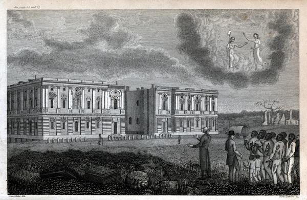 Engraving is set in 1815 in Washington, DC, where a group of bound slaves passes in front of the burned-out Capitol building en route to Georgia. Two allegorical figures, one of whom represents Liberty, float on a smoke cloud above the building. The frontispiece relates to Torrey's musings as to whether "the Sovereign Father of all nations" permitted the burning of the Capitol as a "fiery, though salutary signal of his displeasure at the conduct of his Columbian children, in erecting and idolizing this splendid fabric as the temple of freedom, and at the same time oppressing with the yoke of captivity and toilsome bondage, twelve of fifteen hundred of their African brethren (by logical induction), making merchandise of their blood, and dragging their bodies with iron chains, even under its towering walls." Torrey then commented, "Yet it is a fact, that slaves are employed in rebuilding this sanctuary of liberty."