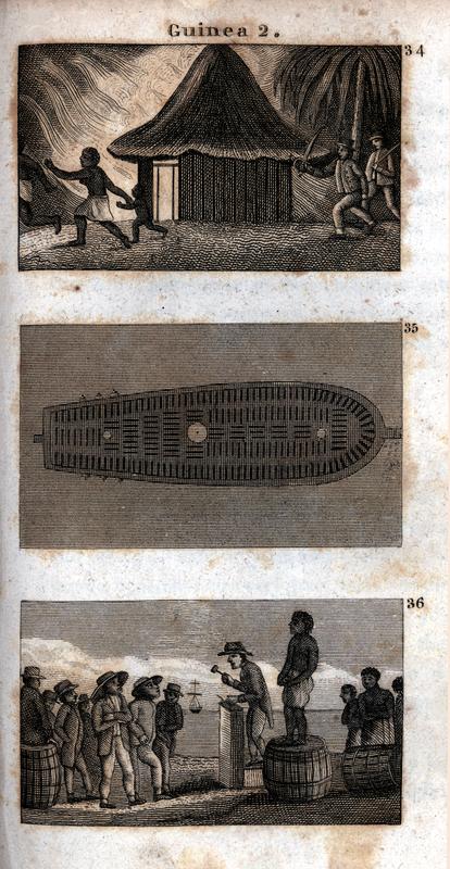 Three illustrations accompanying Taylor's discussion of Guinea. In figure 34, two Europeans try to kidnap an African family to sell them into slavery. Of this practice, Taylor wrote: "they [the Europeans] lie in wait near a village during the day, and catch any stragglers; but at night they come and set fire to their huts in several places; when the poor creatures run out in terror and confusion, then the soldiers seize upon all they can catch, and hurry them away to the sea-side, to sell them." (p. 62) Figure 35 shows the plan of a slave ship. Taylor described the conditions on board as follows, "only sixteen inches each, in width, are allowed for the men, and less still for women and children. There they lie, so close, that it is impossible to walk among them, without treading upon them." (p. 63) Figure 36 depicts slaves being sold at auction. Each slave, Taylor explained, was forced to stand on a hogshead, for easier inspection, while the planters offered their bids.