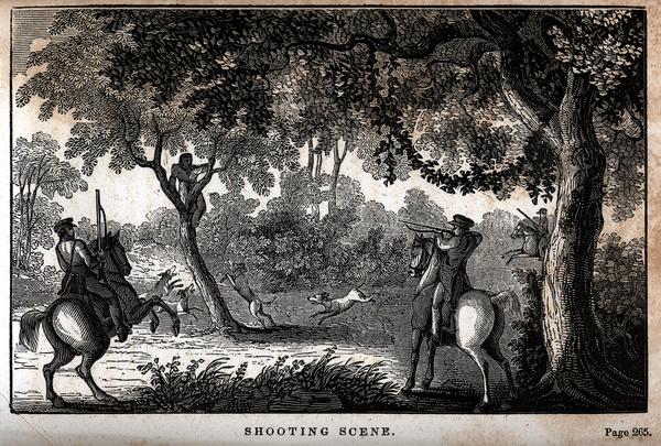 Engraving shows a slave being hunted by three men with dogs and guns.