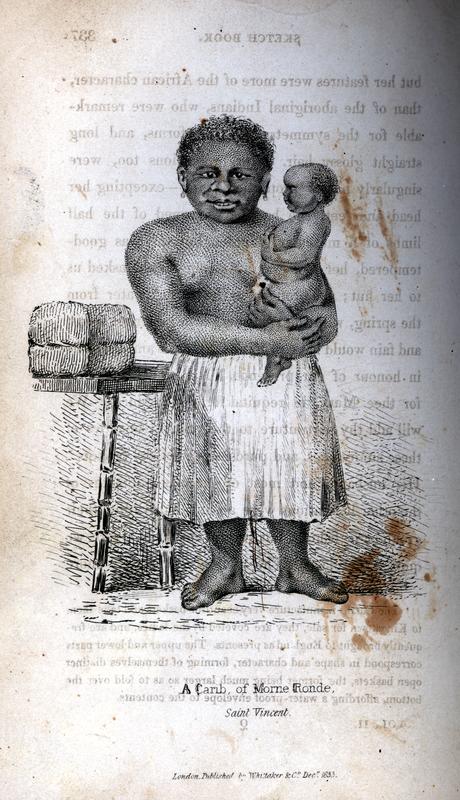 Portrait image of Mary and her child, two Caribs whom Wentworth met in Morne Ronde on St. Vincent. According to Wentworth, Mary's features "were more of the African character, than of the aboriginal Indians, who were remarkable for the symmetry of their forms, and long straight glossy hair." "Her proportions, too," he wrote, "were singularly out of proportion, as if -- excepting her head and feet, she had been formed of the half limbs of a muscular giantess." (p. 337)