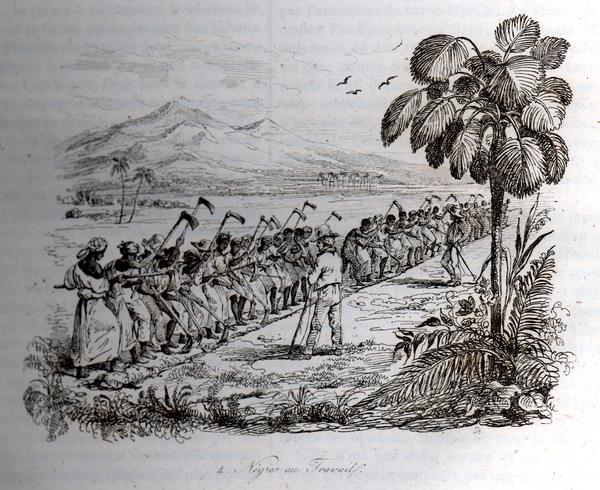 Engraving accompanies Chapter IV, "Haiti.- Géographie. - Histoire." Under the supervision of two overseers with whips, approximately thirty slaves dig a trench that may be used to irrigate sugar cane fields. Swinging sharp hoes, the slaves stand in a line that stretches far into the background.