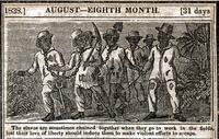 Caption underneath the image reads: "The slaves are sometimes chained together when they go to work in the fields, lest their