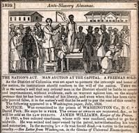 A free black man who has been kidnapped is auctioned before a crowd of white bidders. A small black child sits on the auction block. In the background, other kidnapped free blacks wait to be sold into slavery. A building marked "JAIL" is visible in the distant background.
