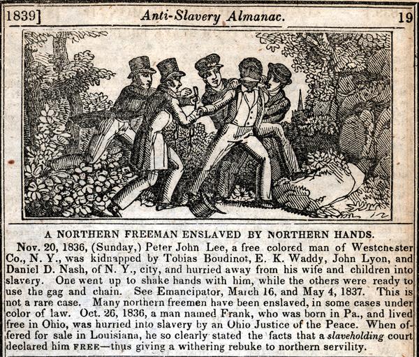 Image depicts an incident that occurred in the North (presumably, New York) in November, 1836. Peter John Lee, a free black man from Westchester, New York, was kidnapped by Tobias Boudinot, E.K. Waddy, John Lyon, and Daniel D. Nash, all of New York City, who gagged and chained him, and then hurried him away from his wife and children into slavery.