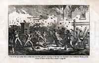Scene depicts an incident that occurred in Philadelphia (the city proper and Moyamensing) on Election night, October 11, 1849. The incident began when a group of white boys and men dragged a flaming furniture car through the area around St. Mary Street, a neighborhood inhabited primarily by blacks. As the car travelled along, a shot was fired, and a cry arose that a white man had been shot. Having heard this, the mob headed toward the California house at Sixth and St. Mary, which was kept by a black man who was rumored to have a white wife. A riot ensued, and the California house was destroyed in a fire that claimed many other buildings and numerous lives.