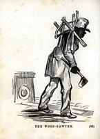 Illustration shows a familiar Philadelphia character: a black wood-sawyer. As the text explains, "This is a hard occupation, followed generally by coloured people. They are old men, and have little ones to support, so that they have to work very hard." Shown in full profile, this mature wood-sawyer carries an axe in his hand and a "Horse" on his back. According to the text, when the wood-sawyer cuts his logs, he puts them on this "curious-four legged machine," which is "very strong, and made of oak or hickory wood." Holding the logs down with one knee, the wood-sawyer cuts off one piece at a time.