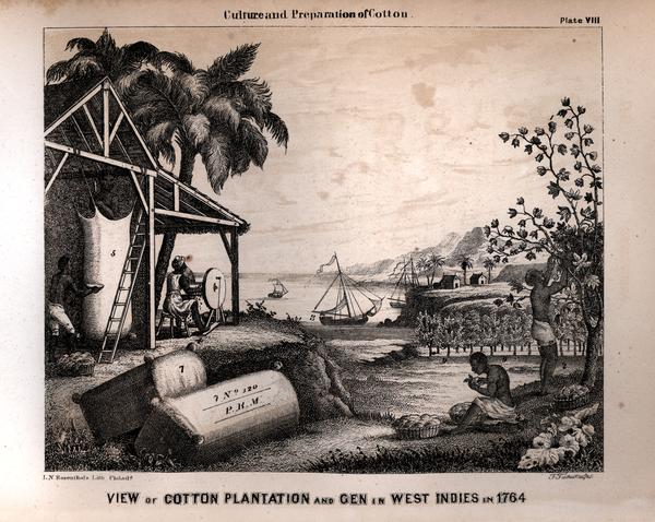 According to the title, the image is set in the West Indies in 1764. The lithograph accompanies a brief discussion of the history of cotton cultivation in the New World. The featured plantation is situated near the coast, and three ships (presumably trading vessels) are visible in the background. In the right foreground, a slave picks cotton from a plant and places it in a basket. Behind him, another slave carefully cleans the picked cotton. At the far left, a female slave operates an early cotton gin, and two men pack large sacks of finished cotton. Two full sacks of cotton occupy the left foreground; one bears the label "7 No. 120 / P.R.M."