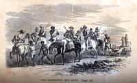 Engraving portrays an episode described in Hildreth's fictional narrative. With blood- hounds in tow and "armed to the teeth," a party of mounted slave-hunters proceeds with two captured fugitives: the young man marching in front around whose neck a rope has been tied, and the older man, identified in the narrative as Wild Tom, who rides on horseback and whose arms are tied behind his back. In the center of the image, the lifeless body of Snapdragon, a Yankee overseer, is draped over a horse. He was killed by Wild Tom during the course of the man hunt.