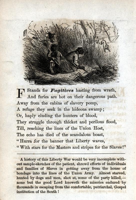 Image is accompanied by a verse, which begins as follows: "F Stands for Fugitives hasting from wrath, / And furies are hot on their dangerous path. /." A group of four fugitive slaves, including a mother and child, hide in a thicket, hoping to avoid the bloodhounds who trail them. To the left, in the distant background, an American flag waves.