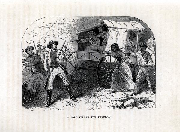 Engraving depicts an incident that is said to have occurred near the Maryland state line on December 25, 1855. As the accompanying narrative suggests, six slaves from Virginia's Loudoun and Fauquier counties (Barnaby Grigby, his wife, Mary Elizabeth Grigby, Frank Wanzer, Emily Foster, and two others) had taken their master's horses and carriage, and were on their way to freedom. Near the Cheat River in Maryland, they were attacked by "six white men and a boy," who demanded their passes, and then ordered their surrender. The fugitives retaliated, and the four travelling in the carriage made a successful escape. Two others on horseback were assumed to have been captured.