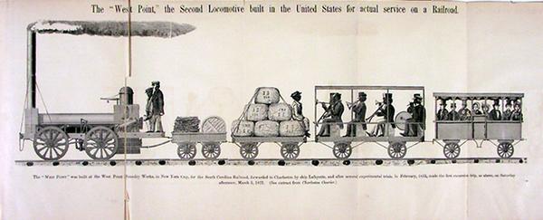 Caption below the illustration reads: "The 'West Point' was built at the West Point Foundry Works, in New York City, for the South Carolina Railroad, forwarded to Charleston by ship Lafayette, and after several experimental trials, in February, 1831, made the first excursion trip, as above, on Saturday afternoon, March 5, 1831. (See extract from Charleston Courier.)