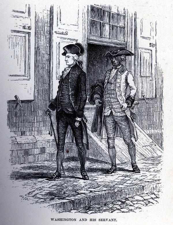 Illustration included in Chapter II, "First Years of the Constitution." It shows President George Washington walking on a cobblestone sidewalk with his black manservant, who follows a few steps behind him. Image appears in the context of a discussion of Washington's taste for fashion and "courtly etiquette," and it relates to the following passage: "When he walked the streets his body-servant in livery followed him at respectful distance." Carrying a walking-stick, the well-dressed Washington wears breeches, a dark vest and waistcoat, and a bicorne, a type of hat commonly worn by intellectuals. His servant carries his dark-colored overcoat. The servant himself wears a lighter suit and a tricorne.