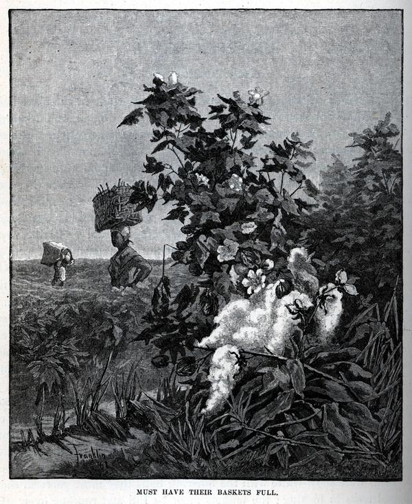 Illustration included in Chapter XXVII, "Compromise of 1850." Set on a plantation, it shows two slaves, a man and a woman, at work in a cotton-field. Woman balances a basket of cotton on her head, while the man carries his on his shoulders. Image relates to the following description of slave life: "From the auction-room they went to the plantation to work in the cotton-fields, beneath the broiling sun, driven by a brutal overseer sitting on a horse, with a whip in his hand, which he delighted to crack over them, or to bring down upon the back of any one that lagged. The weak and feeble must keep up with the strong in wielding the heavy hoe. When the fields were snow-white with the bursting bolls they must perform their allotted tasks in picking; the baskets must be full and running over: the number of pounds specified for a day's work to be tipped by the steel-yards, or in default they would be flogged." (p. 387)