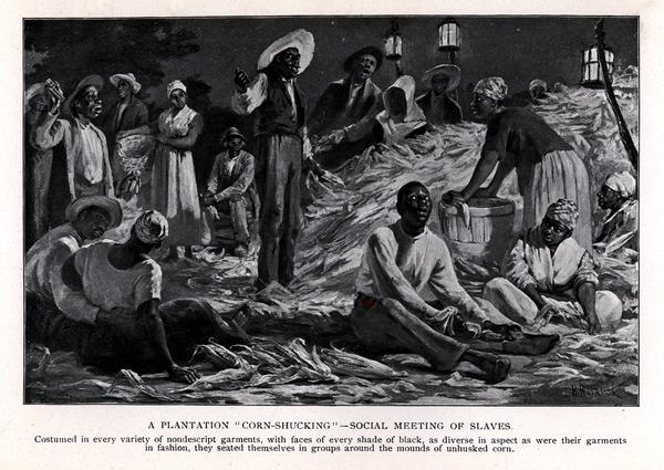 Caption underneath the image reads: "Costumed in every variety of nondescript gaments, with faces of every shade of black, as diverse in aspect as were their garments in fashion, they seated themselves in groups around the mounds of unhusked corn."
