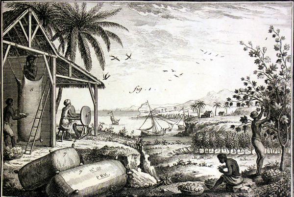 trading vessels) are visible in the background. In the right foreground, a slave picks cotton from a plant and places it in