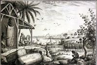 Engraving shows a cotton plantation in the West Indies. The plantation is situated near the coast, and three ships (presumably