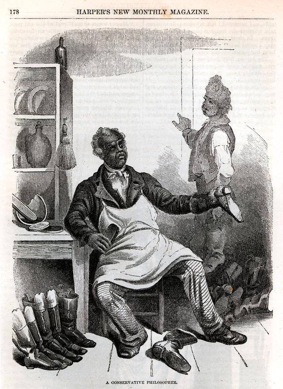 Crayon's "conservative philosopher" is a Virginia boot-black named Billy Devilburg, whose tendency to philosophize about boots and social class earned him this title. Devilburg is shown in his shop, where, surrounded by boots, he holds forth on this topic. According to Crayon, Devilburg was "a specimen of his race that merited more than a casual glance." As he wrote, "time had made strong marks upon his face, but good temper and full feeding had kept out the petty wrinkles which indicate decrepitude. His broad forehead, fringed with grizzled wool, imparted an air of dignity to his countenance, his one eye beamed with honesty, while his quiet, deferential manner inspired the respect it tendered." (p. 178)