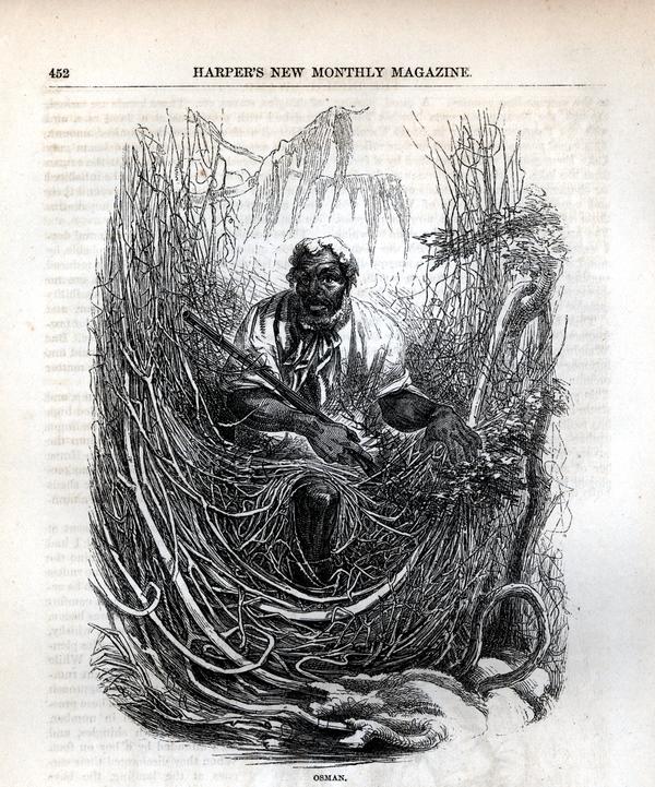 Illustration accompanies the narrative, "The Dismal Swamp." A fugitive slave identified only as Osman sits amidst some tangled