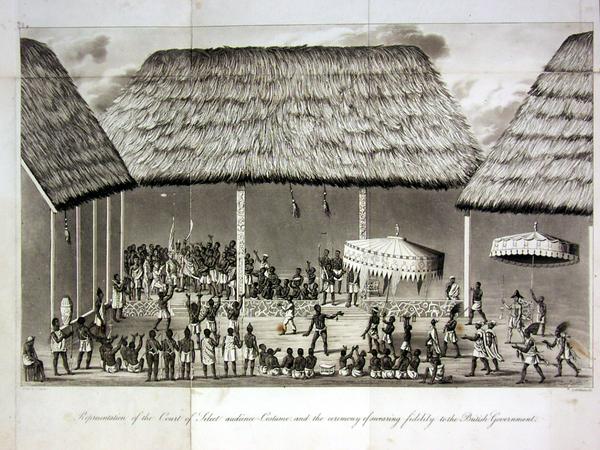 Representation of the court of select audience -- Costume, and the ceremony of swearing fidelity to the British government [graphic] / Drawn by J. Dupuis ; C. Williams sc.