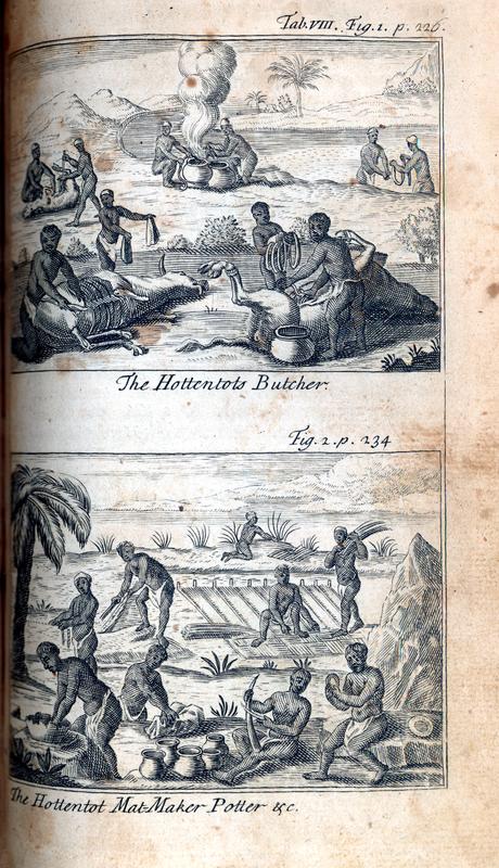 Engravings accompany Chapter XIX, "Of certain Handy-Crafts the Hottentots exercise among themselves." In the foreground of the top image, two pairs of Hottentot [i.e. Khoikhoin] men work separately to butcher two oxen. In the left background, two other men butcher a sheep. A fourth pair boils water in cauldrons; and two others (right) hold the entrails of another animal. The bottom image shows several Hottentot mat-makers and a potter, all of whom appear to be women. (As Kolb wrote, the mat-makers "are, for the most Part, women: And they are very expert in their Business." [p. 236]) In the engraving, the mat-makers are involved in various stages of production: one background figure cuts the reeds out of which the mats will be woven; another woman carries the reeds, and yet another (slightly left of center) lays them on the ground to dry. The woman sitting on the partially finished mat is most likely weaving. In the foreground, a mat-maker strips reeds, while a potter makes a bowl. Several small pots are shown on the ground.