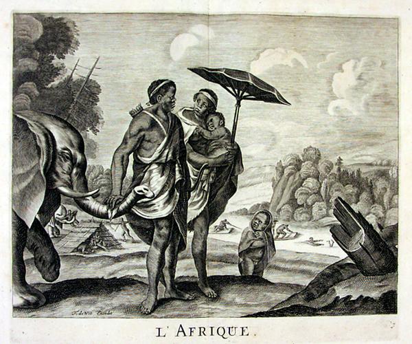 The engraving features an African family and an elephant in the foreground of an idyllic African landscape. The father rests his hand on the elephant's out-stretched trunk; next to him,the mother holds an infant in her arms, shielding the child from the sun with an umbrella. Behind them, others hunt, fish, rest, and swim in a river.
