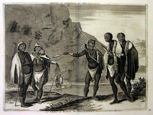 Seemingly, van der Aa copied from an unsigned engraving published in John Ogilby's Africa: Being an Accurate Description of the Regions of Aegypt, Barbary, Lybia, and Billedulgerid (London: 1670) under the title "Dracht en Wapening der Hottentots / The Hottentots Clothing and Their Arms."