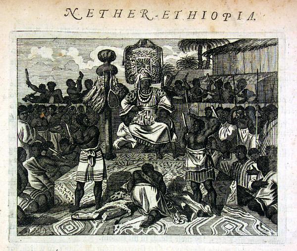 Shows the throne or ("seat") of an African King in Nether-Ethiopia. According to Ogilby's text, "The Stool, or Seat, whereupon