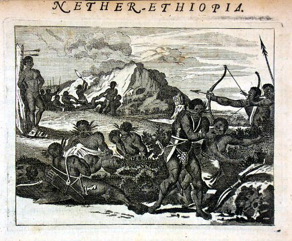 Illustration in John Ogilby's Africa: Being an Accurate Description of the Regions of Aegypt, Barbary, Lybia, and Billedulgerid: the Land of Negroes, Guinee, and Aethiopia, and Abyssines, with all the Adjacent Islands, either in the Mediterranean, Atlantick, Southern, or Oriental Sea, Belonging Thereunto (London: Printed by Tho. Johnson, for the author, and are to be had at his house in White Fryers, M.DC.LXX [1670]), p. 603.