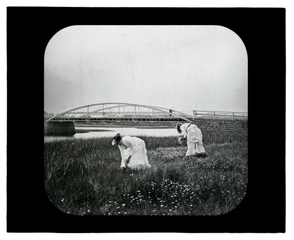 Lantern slide showing two women gathering flowers in a field near a river at Sea Girt. A stone and metal bridge crosses the river in the background. The women wear long white dresses and hats.