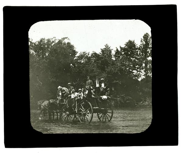 Lantern slide showing a group of men and boys from the Germantown Boys' Club crowded onto a horse-drawn cart. The cart travels through shallow water with trees growing in the background. Founded in 1887, the Boys’ Parlors Association of Germantown served as a safe space for neighborhood children whose parents worked longer hours in an industrializing city. The name changed in 1907 to the Germantown Boys’ Club after joining ranks with the Boys and Girls Clubs of America. Marriott Canby Morris served as the president of the club in the first decade of the 1900s.