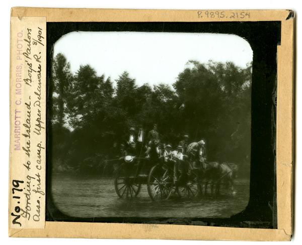 Lantern slide showing a group of men and boys from the Germantown Boys' Club crowded onto a horse-drawn cart. The cart travels through shallow water with trees growing in the background. Founded in 1887, the Boys’ Parlors Association of Germantown served as a safe space for neighborhood children whose parents worked longer hours in an industrializing city. The name changed in 1907 to the Germantown Boys’ Club after joining ranks with the Boys and Girls Clubs of America. Marriott Canby Morris served as the president of the club in the first decade of the 1900s.