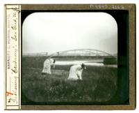 Lantern slide showing two women gathering flowers in a field near a river at Sea Girt. A stone and metal bridge crosses the river in the background. The women wear long white dresses and hats.
