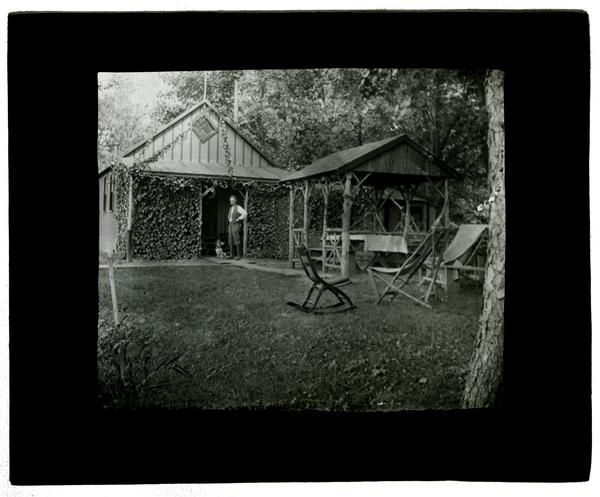 Lantern slide showing a man, possibly Jas. S. Willis, and dog standing in the doorway of Willis' house. The house is covered in ivy with a diamond shaped window in the gable. A picnic table sits under a wooden portico and three lawn chairs sit in the grass.