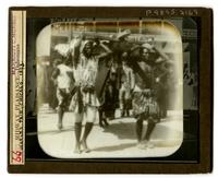 Lantern slide showing a group of barefooted Black men Dahomans carrying a man in a fabric litter during the World's Columbian Exposition in Chicago in 1893. The four men rest the wooden beams on top of their heads on head pads and hold their hands above their heads to support the beams. In the front left, the barechested man is attired in a necklace and a floral patterned sarong. In the front right, the man is attired in a sleeveless shirt with an American flag print, a belt with a pouch, and knee-length white shorts. In the right rear, the man is attired in a sleeveless white shirt, knee-length shorts, and an arm bracelet. In the background, white men and women spectators look on. The Kingdom of Dahomey was a West African kingdom located within present-day Benin that existed from approximately 1600 until 1904. Dahomey developed on the Abomey Plateau amongst the Fon people, a Gbe ethnic group.